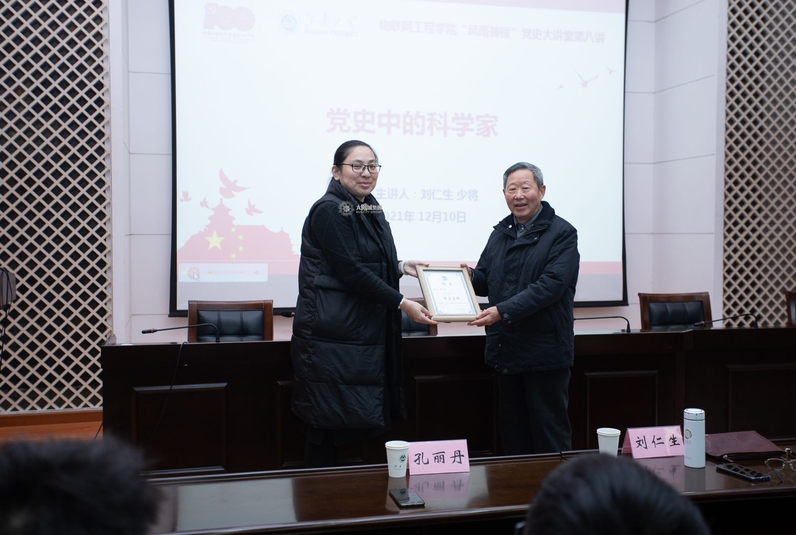 12月10日下午,物联网工程学院“风雨兼程”党史大讲堂第八讲在学院D328报告厅举行。远望号基地原副司令、总工程师刘仁生应邀主讲专题党课,物联网工程学院党委副书记、副院长孔丽丹出席本次活动,学院第十四期入党积极分子培训班学员、第十二期青年马克思主义者培养工程学员150余人现场聆听党课。活动由辅导员王志顺主持。