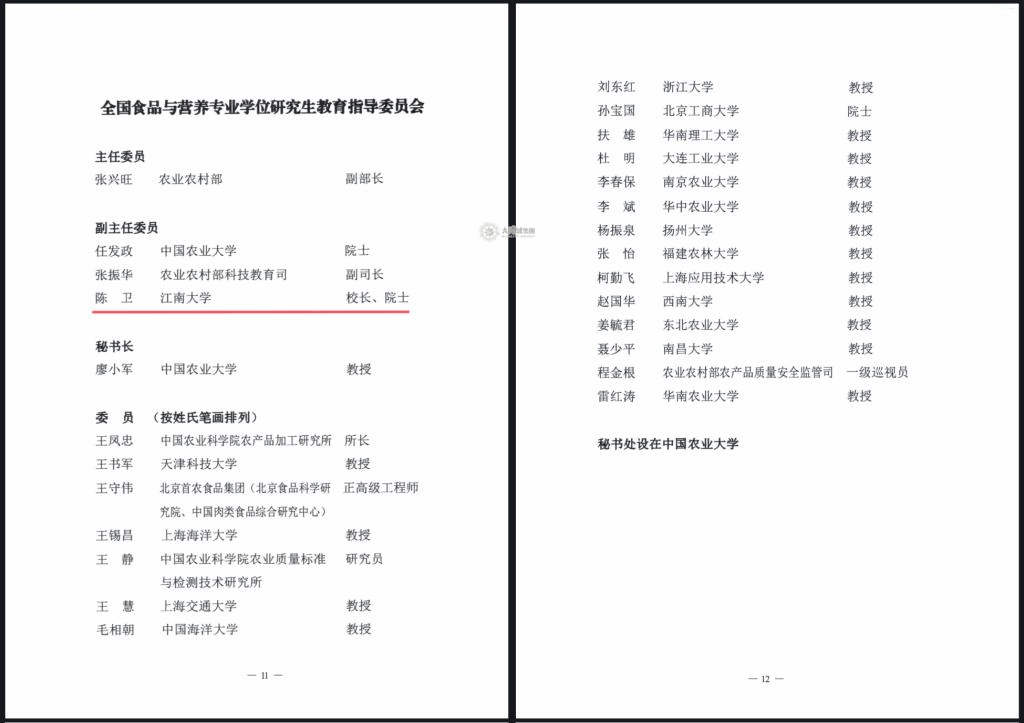 近日,国务院学位委员会、教育部、人力资源社会保障部联合下发《关于成立和调整全国应用伦理等 12 个专业学位研究生教育指导委员会的通知》(学位﹝2023﹞7号),决定成立食品与营养等9个专业学位研究生教育指导委员会(以下简称教指委),调整中医中药针灸、艺术2个教指委,合并组建风景园林教指委。我校陈卫教授当选全国食品与营养专业学位研究生教育指导委员会副主任委员,魏洁教授当选全国设计专业学位研究生教育指导委员会委员。这是我校教授首次当选全国专业学位研究生教育指导委员会副主任委员,也是我校首次两位教授同时当选该委员会委员,表明我校专业学位研究生教育能力和水平的有效提升。