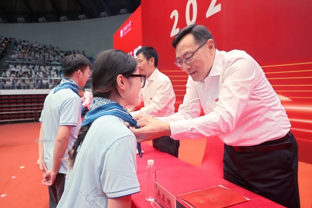校党委书记吴正国为新生授予“太阳城人”丝带