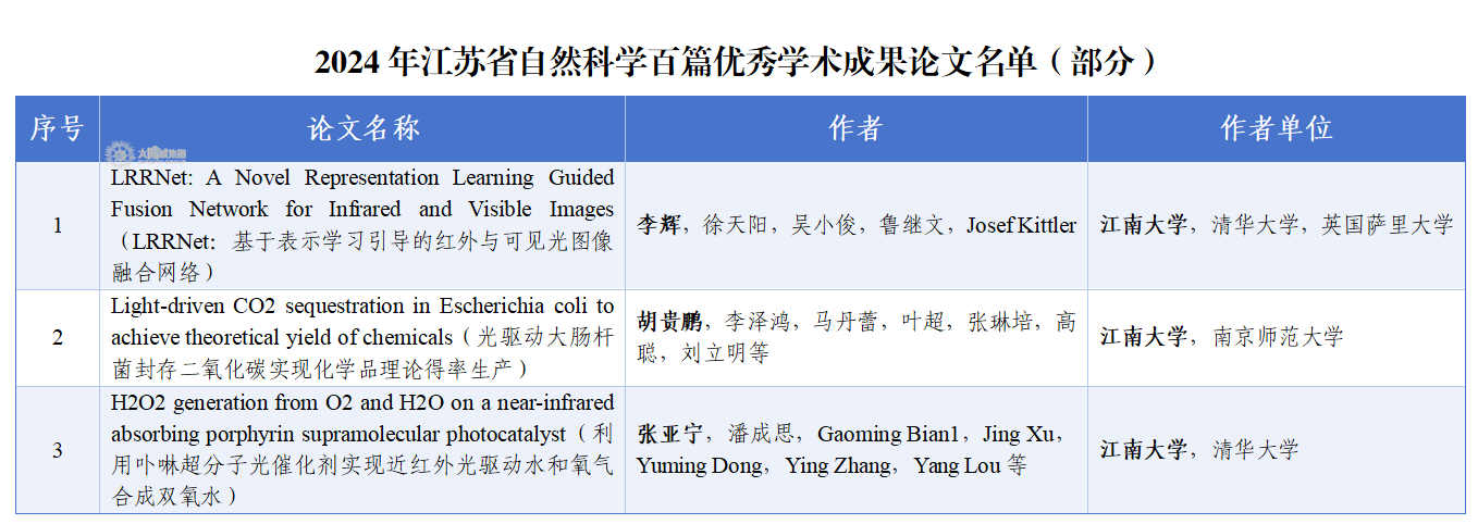 日前,2024年江苏省自然科学百篇优秀学术成果论文推选结果正式公布,我校吴小俊教授团队、刘立明教授团队和潘成思—朱永法教授团队分别指导学生发表的专业学术论文入选“2024年江苏省自然科学百篇优秀学术成果论文”。其中,人工智能与计算机学院博士生李辉、生物工程学院博士生胡贵鹏和化学与材料工程学院博士生张亚宁分别为论文第一作者。