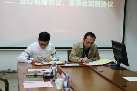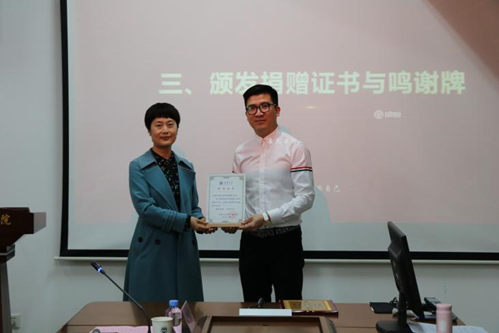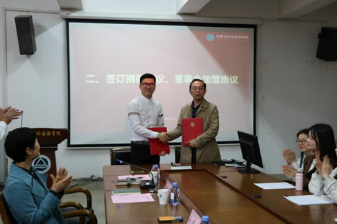 在同学们的阵阵掌声中,双方签订捐赠协议、董事会加盟协议。院长方文开为上海少威电子科技有限公司总经理华锦洲颁发捐赠证书;学院党委书记李荣华向上海少威电子科技有限公司总经理华锦洲颁发鸣谢牌。