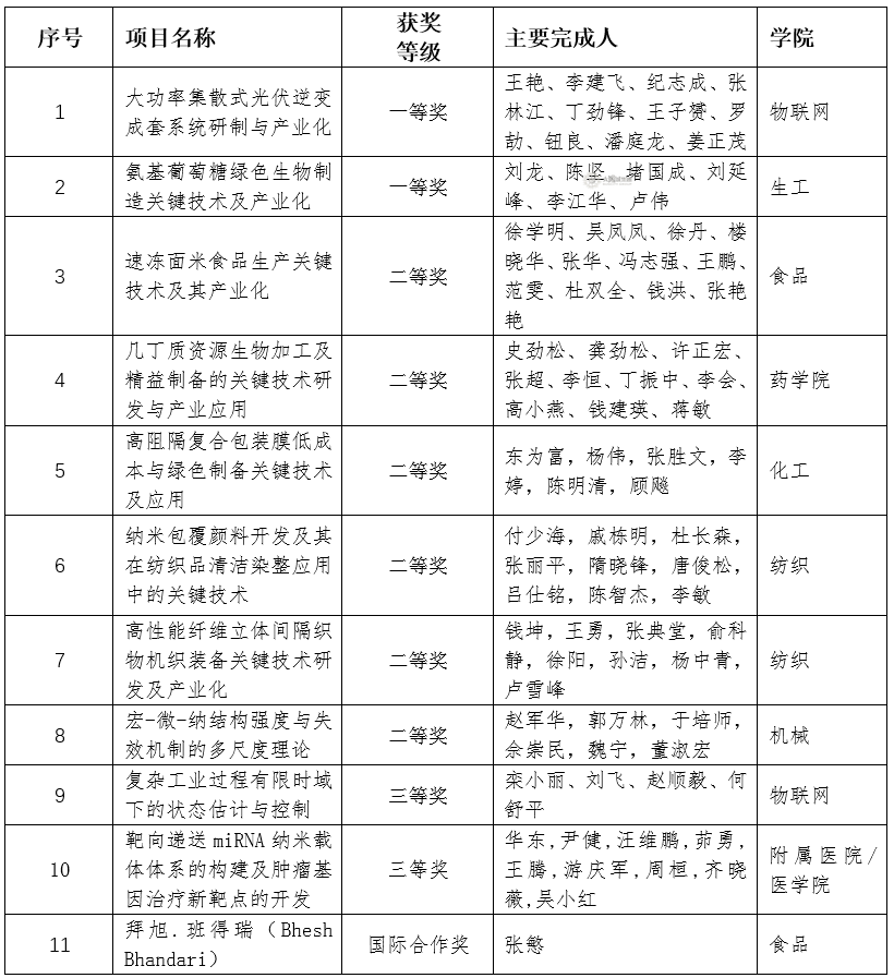 获奖项目中,物联网工程学院王艳教授领衔的成果“大功率集散式光伏逆变成套系统研制与产业化”和生物工程学院刘龙教授领衔的成果“氨基葡萄糖绿色生物制造关键技术及产业化”获江苏省科学技术一等奖;食品学院张慜教授的合作伙伴拜旭·班得瑞(Bhesh Bhandari)教授获江苏省国际科学技术合作奖。