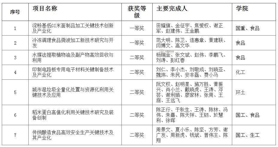 获奖项目中,食品科学与技术国家重点实验室田耀旗教授领衔的成果“淀粉基低GI米面制品加工关键技术创新及产业化”和食品学院范大明教授领衔的成果“冷冻调理食品微波加工新技术研究与开发”获技术发明一等奖。