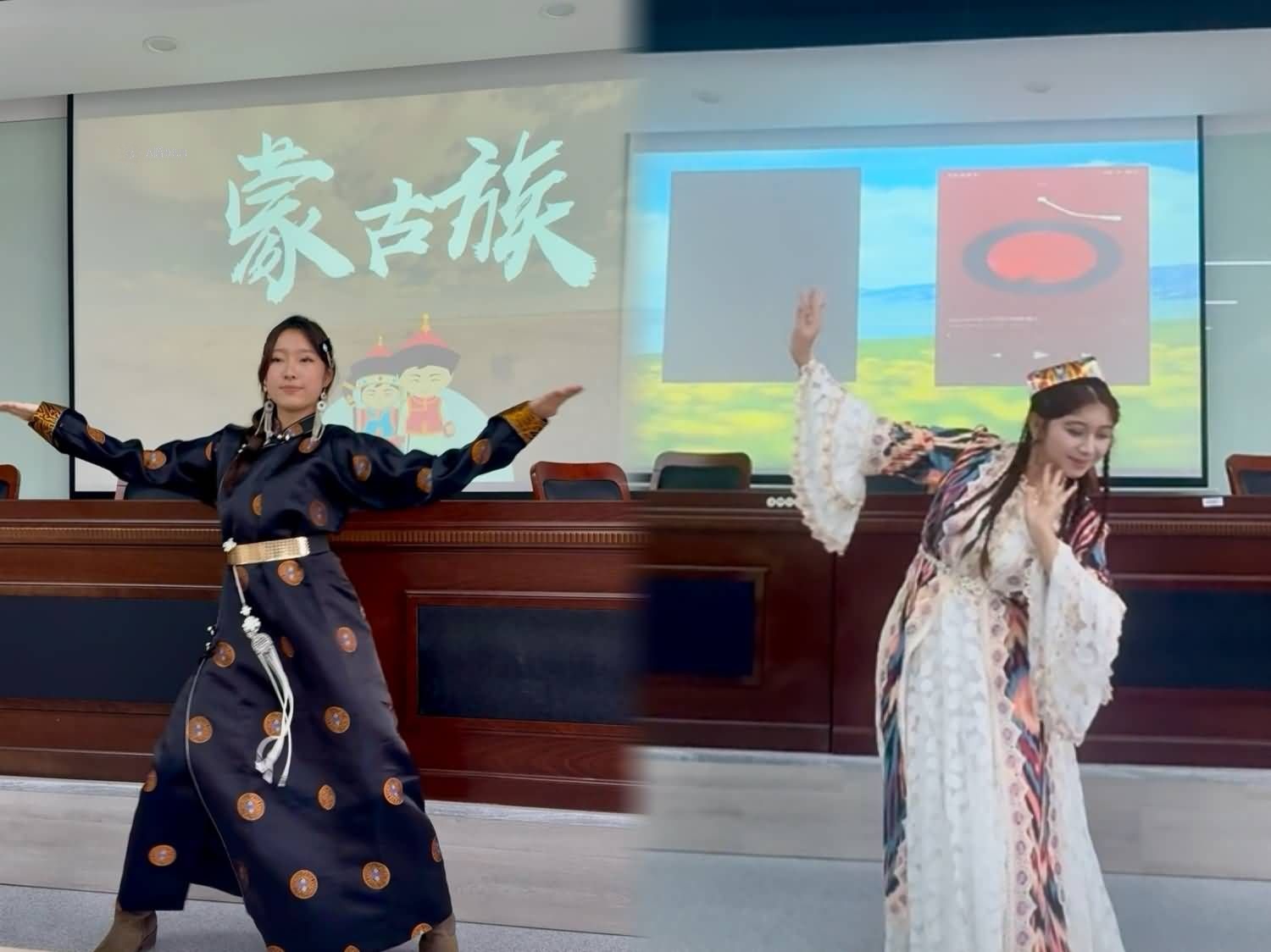 随后,来自蒙古族、维吾尔族、苗族、土家族等民族的学生代表依次登台,倾情呈现了一场异彩纷呈的文化展演。他们围绕民族的历史源流、语言文字、服饰艺术、节庆习俗、饮食民居以及音乐舞蹈等多个维度,借助PPT、视频、音乐和实物展示等丰富形式,将各自民族的独特风貌娓娓道来。