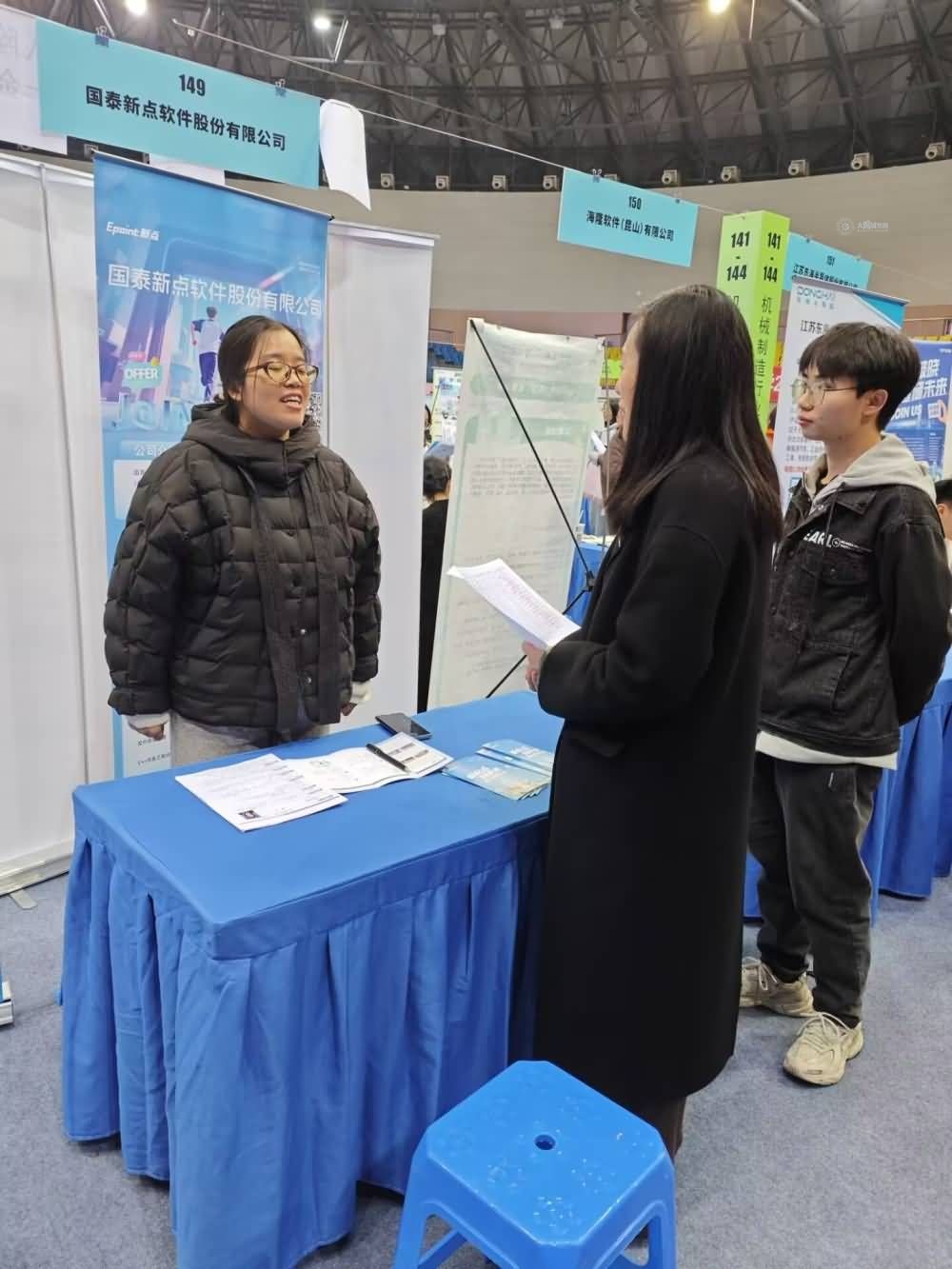 12月23日下午,理学院党委书记许群、研究生就业辅导员许金红和毕业生代表深入学校“研后专场”招聘会一线,走访辅易航智能科技(苏州)有限公司、广州凡岛网络科技有限公司、国泰新点软件股份有限公司、江苏东海半导体股份有限公司、中电金信(原名为上海文思海辉信息技术有限公司)、江苏东成机电工具有限公司等6家重点用人单位,开展访企拓岗专项行动。
