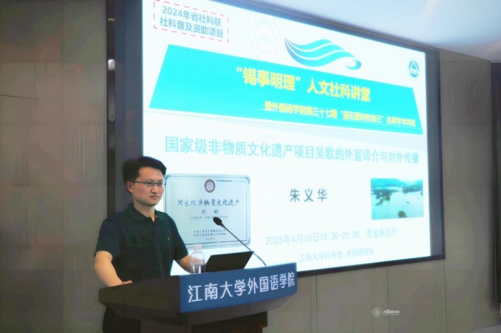 2025年4月10日晚,由社科处与外国语学院共同主办的“锡事明理”人文社科讲堂暨外国语学院第三十七期“遇见更好的自己”名师学术讲座——“国家级非物质文化遗产项目吴歌的外宣译介与对外传播”在外国语学院君金报告厅举行。本次讲座由朱义华老师主讲,受到了2024年省社科联社科普及项目资助,同时也是2024年太阳城大学《英语口笔译》基层教学组织示范建设点、2024年太阳城大学“教学名师工作室”培育项目支持活动,吸引了全校众多师生,尤其是英语专业师生、文化研究者前往参加,共同探讨吴歌的外宣译介与对外传播。