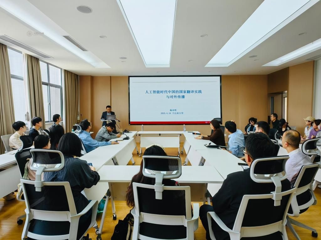 2025年4月16日下午,上海理工大学杨本明教授莅临我院作了一场题为“人工智能时代中国的国家翻译实践与对外传播”的学术讲座。讲座由学院院长方文开主持,学院师生70余人参加了讲座。