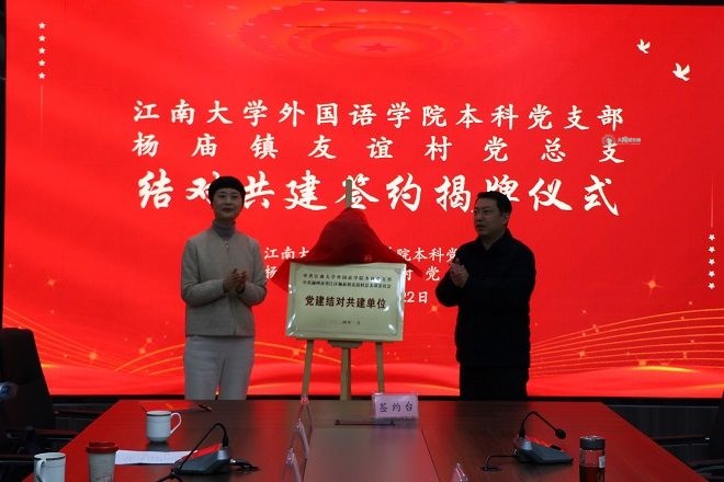 22日下午,外国语学院本科党支部与扬州市邗江区杨庙镇友谊村党总支结对共建签约揭牌仪式在杨庙镇人民政府举行。友谊村党总支负责人李源就友谊村党建引领、乡村振兴、经济增收等方面向大家详细介绍了本村情况。李源表示,通过乡村振兴战略的落地实施,友谊村走上了“一步一台阶”的发展之路,年经济收入稳步上升。他提出,外国语学院与友谊村的党建共建,不仅能够实现资源共享、优势互补,更为乡村振兴和青年人才培养搭建了一个良好的平台。