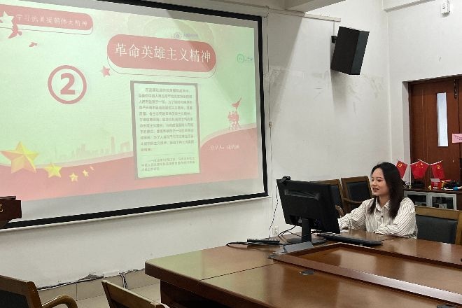 座谈会正式开始,三位党支部成员轮流为学生们介绍抗美援朝伟大精神。罗品辉同学首先简要介绍了抗美援朝精神的内涵,即爱国主义精神、革命英雄主义精神、革命乐观主义精神、革命忠诚精神和国际主义精神。随后,她就爱国主义精神展开详细阐述,围绕“什么是爱国主义精神”和“如何弘扬爱国主义精神”两大基本问题带领同学们学习爱国主义精神并结合前国家总理李克强的讲话视频及当下流行短剧《逃出大英博物馆》引导同学们感悟爱国主义精神。最后她号召大家弘扬爱国主义精神,构筑中华民族共有精神家园。花靖涵同学带领同学们领悟了英勇顽强、舍生忘死的革命英雄主义精神和不畏艰难困苦、始终保持高昂士气的革命乐观主义精神,并结合国家当前形势,探讨了如何将这两个伟大精神应用到社会实践中去。张海熠同学则通过分享历史小故事的方式介绍了革命忠诚精神和国际主义精神。他总结道,革命忠诚精神是抗美援朝精神的底蕴,是支撑起志愿军将士革命英雄主义精神和革命乐观主义精神的深层次因素;国际主义精神是抗美援朝精神的有机组成,是激励中国人民志愿军奔赴朝鲜战场的重要动因。
