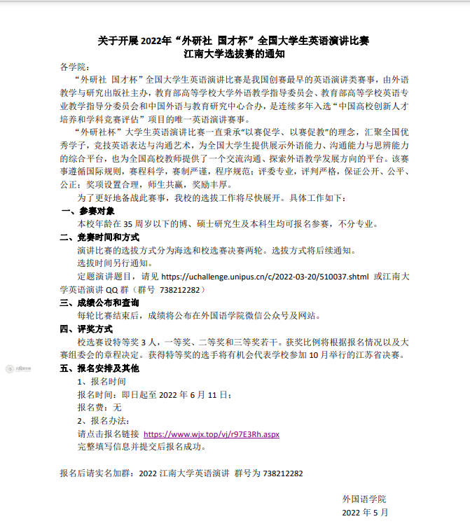 关于开展2022年“外研社 国才杯”全国大学生英语演讲比赛太阳城大学选拔赛的通知