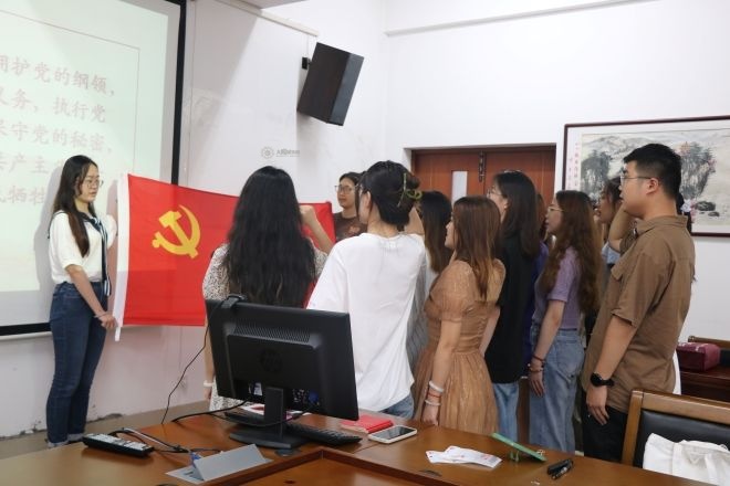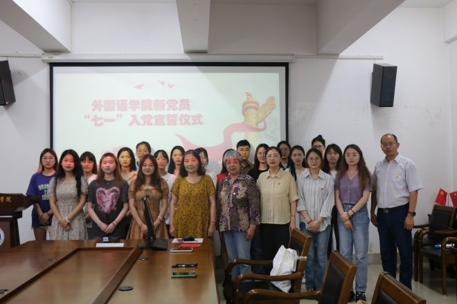 时值“七一”来临之际,为教育党员始终保持党的先进性,激发新党员的责任感和使命感,不忘初心,外国语学院在6月19日14:30于外院楼A349举行新党员“七一”入党宣誓仪式。外国语学院党委副书记刘伯贤、关工委常务副主任鲍国庆、委员吴艳敏、分团委书记陆芳出席宣誓仪式。本次活动共20名新发展党员参加,分团委书记陆芳主持会议。